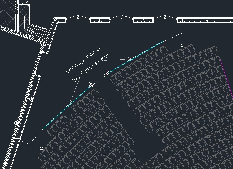 geluidschermen achterin de zaal: